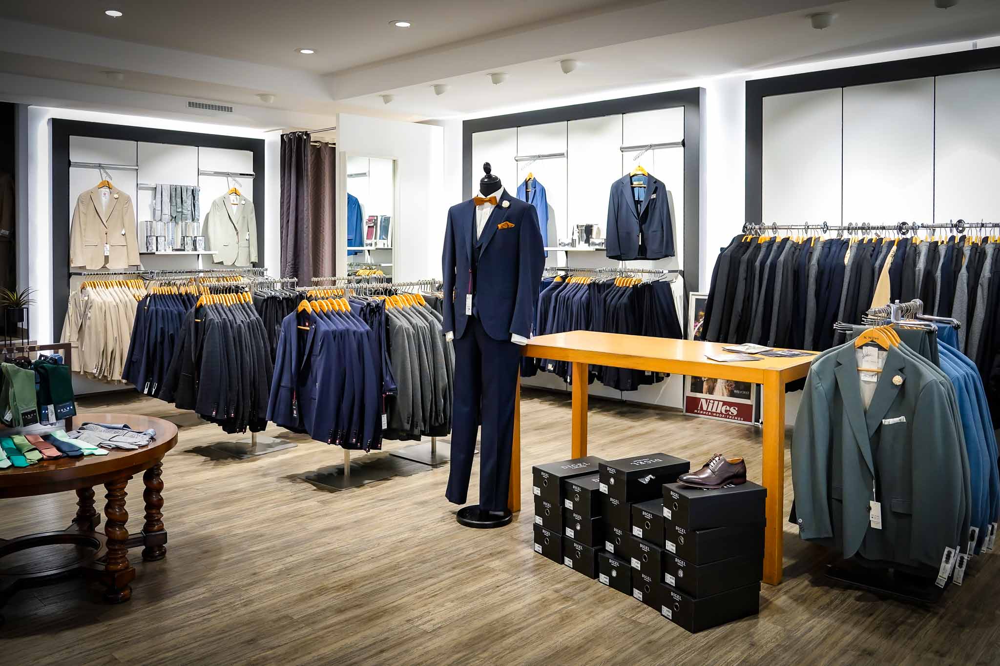 Bei Nilles Männer Mode Trends finden Bräutigame und Gäste elegante Hochzeitsanzüge, Smokings, Gehröcke sowie Leinen- und Jersey-Varianten. Kollektionen von Wilvorst, Atelier Torino, Benvenuto, Tziacco und Club of Gents garantieren hochwertige Stoffe, perfekte Passformen und edle Verarbeitung.